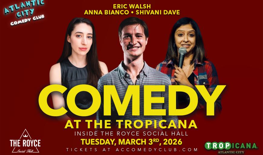 Atlantic City Comedy Club is now located at the Tropicana inside the Royce Social Hall!We bring you the best show in town every weekend. Catch the funniest comedians from New Jersey, Philadelphia, and New York right here in Atlantic City! Your favorite comedians from Late Night TV, movies, popular podcasts, and radio personalities headline our showroom each and every Wednesday, Thursday, Friday, Saturday, and Sunday nights.