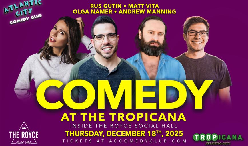 Atlantic City Comedy Club is now located at the Tropicana inside the Royce Social Hall!We bring you the best show in town every weekend. Catch the funniest comedians from New Jersey, Philadelphia, and New York right here in Atlantic City! Your favorite comedians from Late Night TV, movies, popular podcasts, and radio personalities headline our showroom each and every Wednesday, Thursday, Friday, Saturday, and Sunday nights.